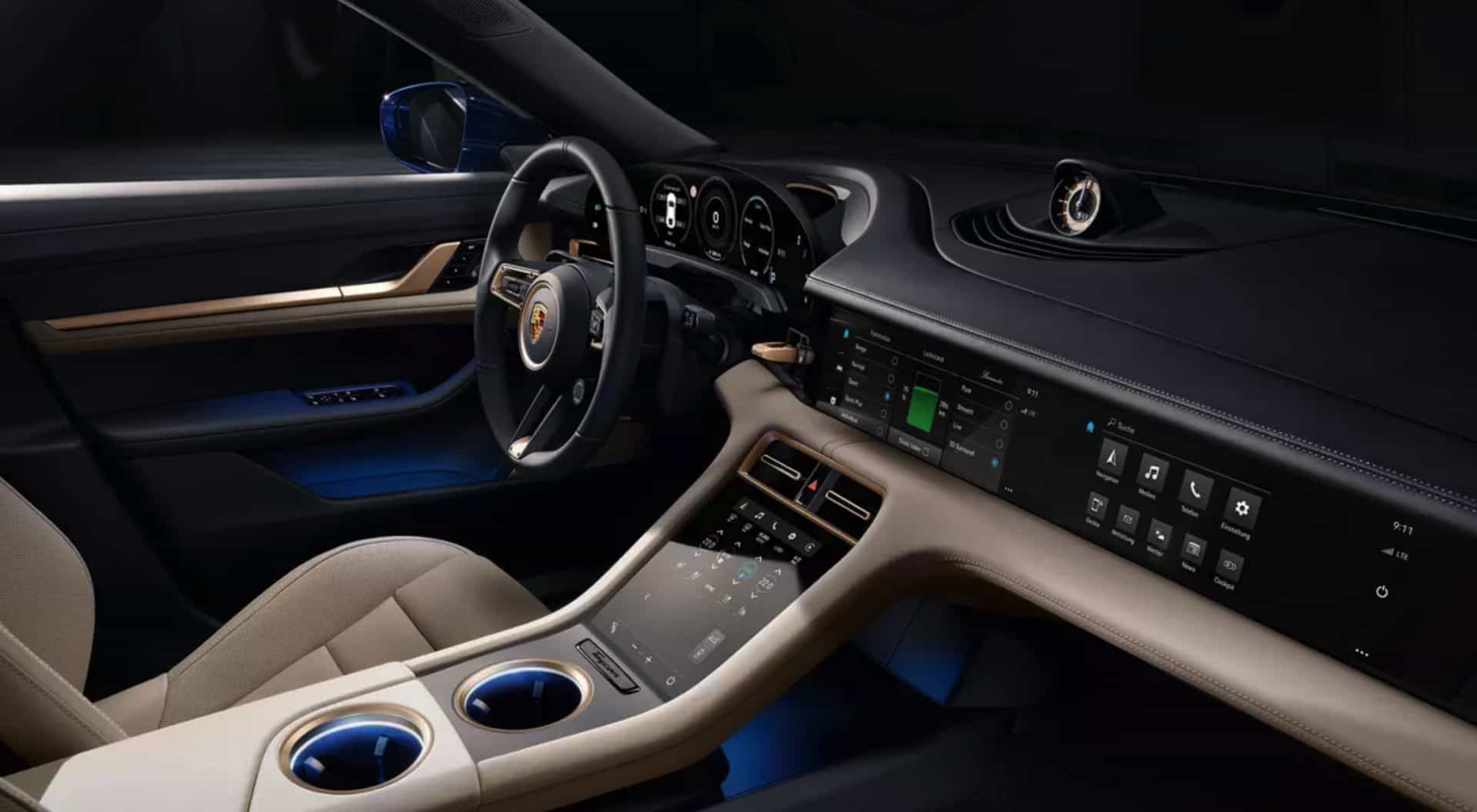 仪表板的上缘和下缘呈翼形贯穿整个仪表台。中央的 10.9 英寸信息娱乐系统显示屏和选装的副驾驶侧显示屏组合成一个整体的黑色面板外观玻璃带,从视觉上与整体内饰相得益彰。全新 Taycan 的交互界面全部经重新设计。诸如开关和按钮等传统控件明显减少,取而代之的是更为智能且直观的控制方式,如触摸操作以及可通过 “嗨,保时捷” 命令唤醒的语音控制功能。