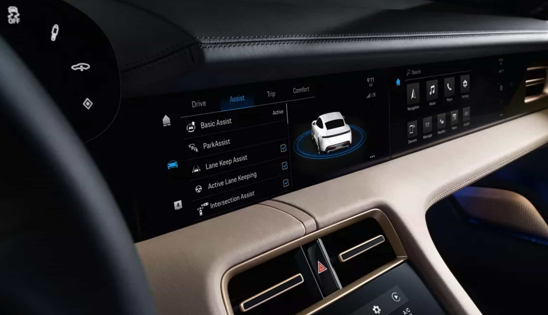 全新 Taycan 所有的车辆设置均可通过中央显示屏直接完成,包括保时捷主动悬挂管理系统(PASM)。主屏幕信息结构清晰,并且支持个性化设置。通过主屏幕,驾驶者可快速访问导航、电话、媒体、舒适功能和保时捷智慧互联(Porsche Connect)的等各项应用程序。语音控制功能经过优化,可让驾驶者更快进入所需的菜单项。在全新 Taycan 上,副驾驶侧首次可以选装显示屏,让前排乘客在不打扰驾驶者的情况下进行便捷操作。